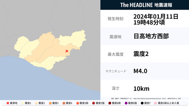 01月11日19時48分頃、日高地方西部を震源とするマグニチュード4.0の地震が観測された。最大震度2を観測したのは、北海道。