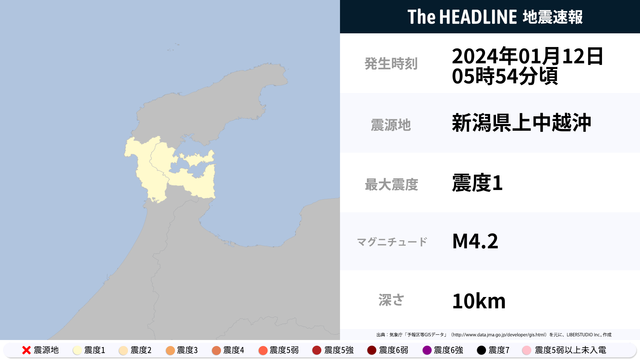 1月12日5時54分頃、新潟県上中越沖を震源とするマグニチュード4.2の地震が観測された。最大震度1を観測したのは、石川県。