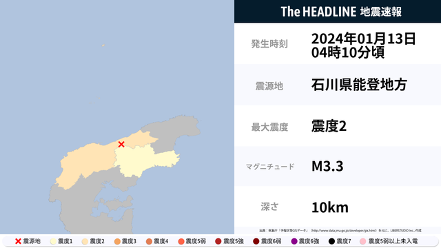 1月13日4時10分頃、石川県能登地方を震源とするマグニチュード3.3の地震が観測された。最大震度2を観測したのは、石川県。