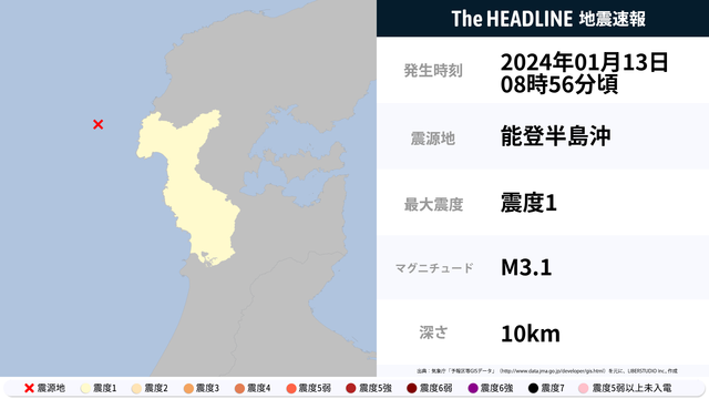 1月13日8時56分頃、能登半島沖を震源とするマグニチュード3.1の地震が観測された。最大震度1を観測したのは、石川県。