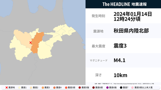 1月14日12時24分頃、秋田県で最大震度3の地震を観測