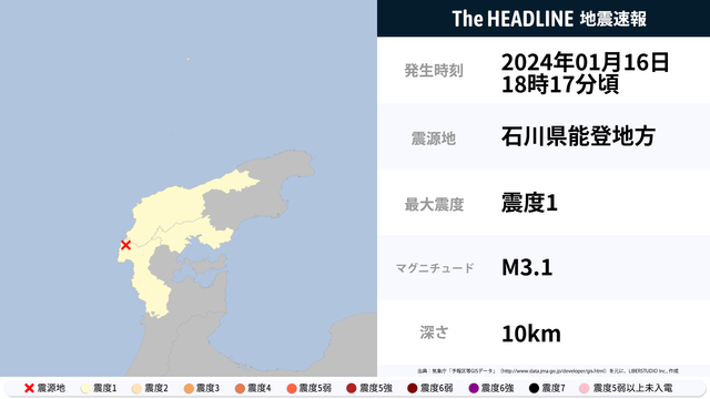 1月16日18時17分頃、石川県能登地方を震源とするマグニチュード3.1の地震が観測された。最大震度1を観測したのは、石川県。