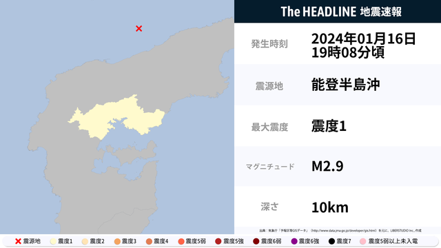 1月16日19時8分頃、能登半島沖を震源とするマグニチュード2.9の地震が観測された。最大震度1を観測したのは、石川県。