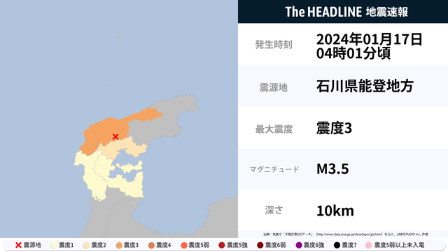 1月17日4時1分頃、石川県で最大震度3の地震を観測