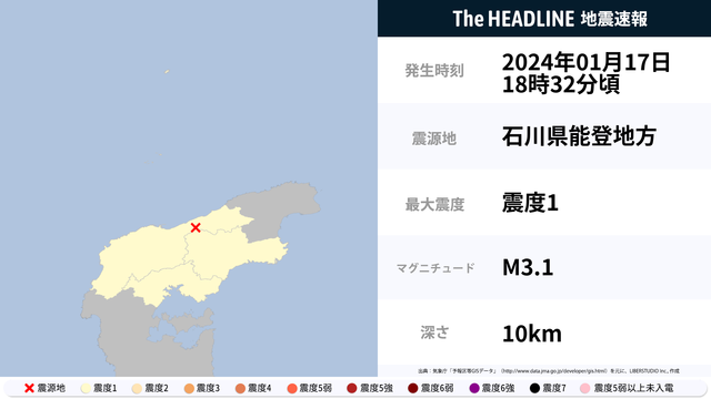 1月17日18時32分頃、石川県で最大震度1の地震を観測