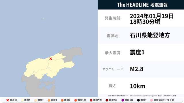 01月19日18時30分頃、石川県能登地方を震源とするマグニチュード2.8の地震が観測された。最大震度1を観測したのは、石川県。