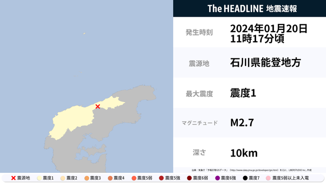 1月20日11時17分頃、石川県能登地方を震源とするマグニチュード2.7の地震が観測された。最大震度1を観測したのは、石川県。