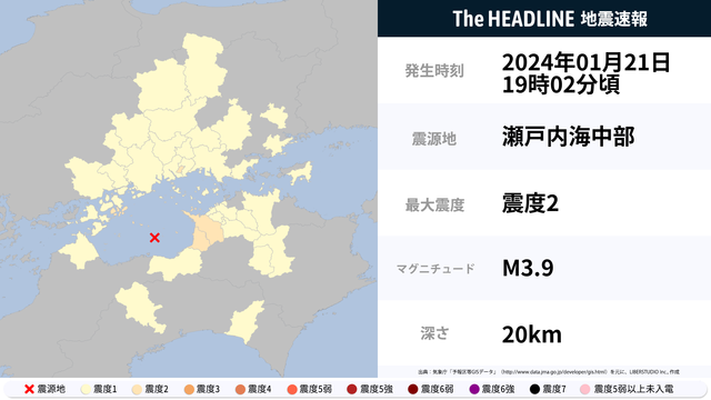 1月21日19時2分頃、瀬戸内海中部を震源とするマグニチュード3.9の地震が観測された。最大震度2を観測したのは、岡山県・香川県など。