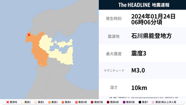 1月24日6時6分頃、石川県で最大震度3の地震を観測