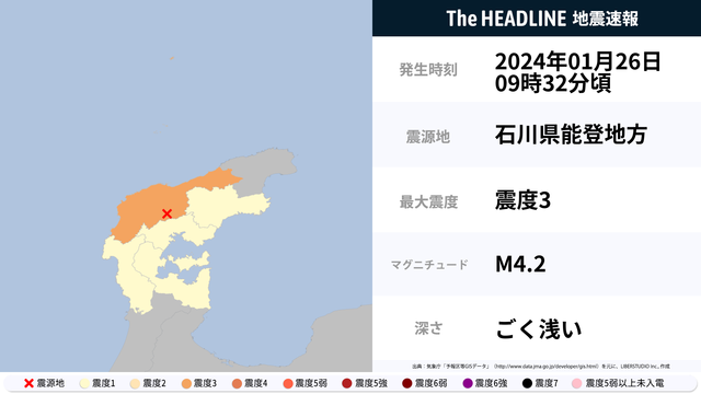 1月26日9時32分頃、石川県で最大震度3の地震を観測