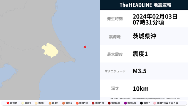 2月3日7時31分頃、茨城県沖を震源とするマグニチュード3.5の地震が観測された。最大震度1を観測したのは、千葉県。