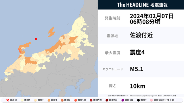 2月7日6時8分頃、佐渡付近を震源とするマグニチュード5.1の地震が観測された。最大震度4を観測したのは、石川県。