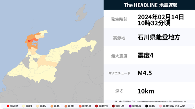 2月14日10時32分頃、石川県能登地方を震源とするマグニチュード4.5の地震が観測された。最大震度4を観測したのは、石川県。