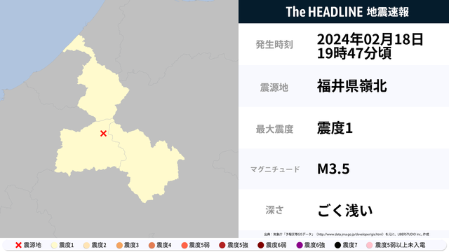 02月18日19時47分頃、福井県嶺北を震源とするマグニチュード3.5の地震が観測された。最大震度1を観測したのは、石川県・福井県など。