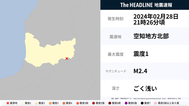 2月28日21時26分頃、空知地方北部を震源とするマグニチュード2.4の地震が観測された。最大震度1を観測したのは、北海道。