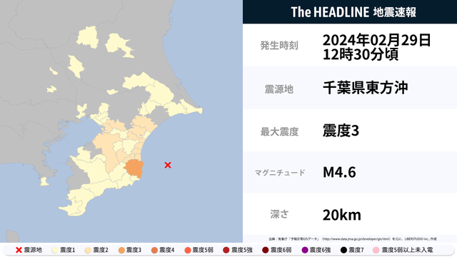 2月29日12時30分頃、千葉県東方沖を震源とするマグニチュード4.6の地震が観測された。最大震度3を観測したのは、千葉県。