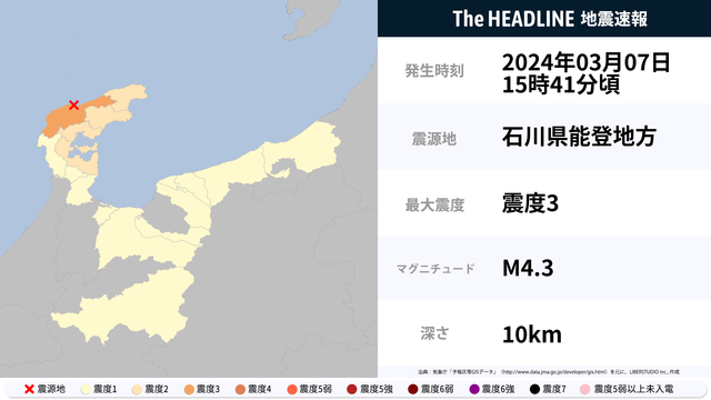 3月7日15時41分頃、石川県能登地方を震源とするマグニチュード4.3の地震が観測された。最大震度3を観測したのは、石川県。