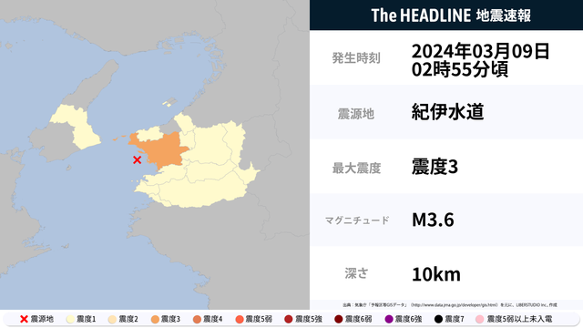 3月9日2時55分頃、紀伊水道を震源とするマグニチュード3.6の地震が観測された。最大震度3を観測したのは、和歌山県。