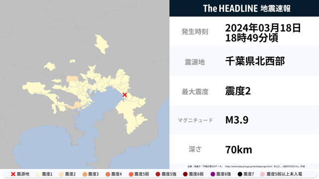 3月18日18時49分頃、千葉県北西部を震源とするマグニチュード3.9の地震が観測された。最大震度2を観測したのは、東京都・神奈川県。