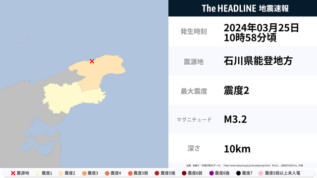 3月25日10時58分頃、石川県能登地方を震源とするマグニチュード3.2の地震が観測された。最大震度2を観測したのは、石川県。