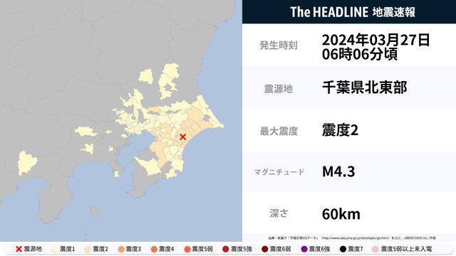 3月27日6時6分頃、千葉県北東部を震源とするマグニチュード4.3の地震が観測された。最大震度2を観測したのは、茨城県・千葉県。