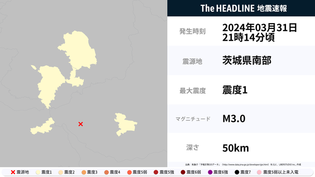 3月31日21時14分頃、茨城県南部を震源とするマグニチュード3.0の地震が観測された。最大震度1を観測したのは、茨城県・栃木県など。