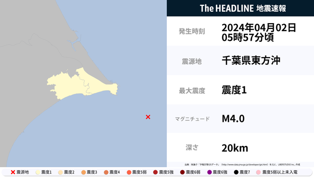 04月02日05時57分頃、千葉県東方沖を震源とするマグニチュード4.0の地震が観測された。最大震度1を観測したのは、千葉県。