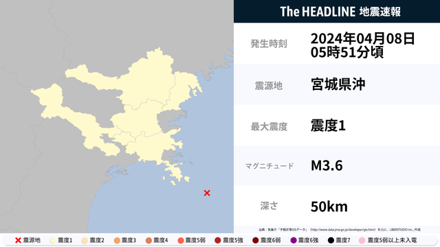 4月8日5時51分頃、宮城県沖を震源とするマグニチュード3.6の地震が観測された。最大震度1を観測したのは、岩手県・宮城県。