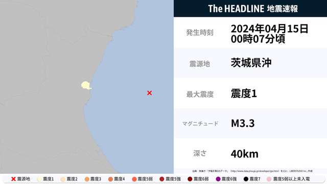 4月15日0時7分頃、茨城県沖を震源とするマグニチュード3.3の地震が観測された。最大震度1を観測したのは、茨城県。