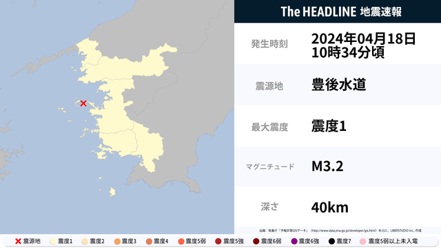 4月18日10時34分頃、豊後水道を震源とするマグニチュード3.2の地震が観測された。最大震度1を観測したのは、愛媛県・高知県。