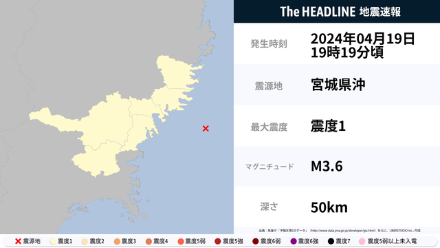 4月19日19時19分頃、宮城県沖を震源とするマグニチュード3.6の地震が観測された。最大震度1を観測したのは、岩手県・宮城県。