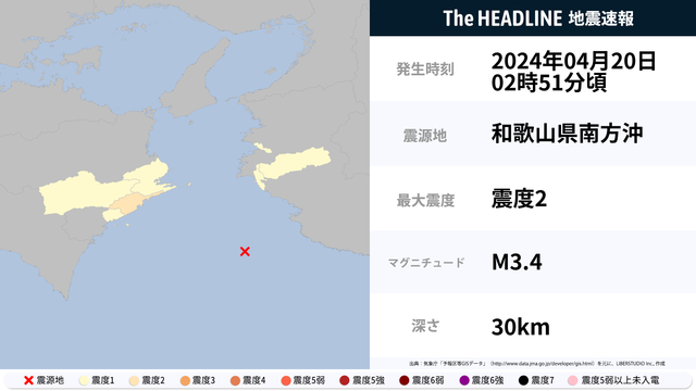 4月20日2時51分頃、和歌山県南方沖を震源とするマグニチュード3.4の地震が観測された。最大震度2を観測したのは、徳島県。