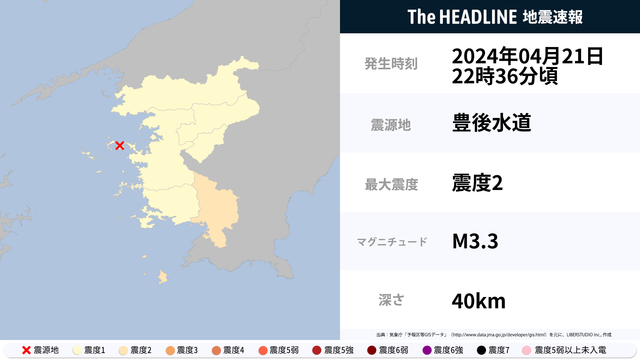 4月21日22時36分頃、豊後水道を震源とするマグニチュード3.3の地震が観測された。最大震度2を観測したのは、高知県。