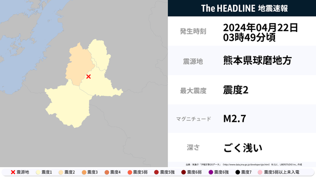 4月22日3時49分頃、熊本県球磨地方を震源とするマグニチュード2.7の地震が観測された。最大震度2を観測したのは、熊本県。