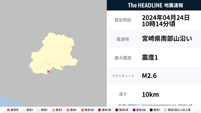 4月24日10時14分頃、宮崎県で最大震度1の地震を観測