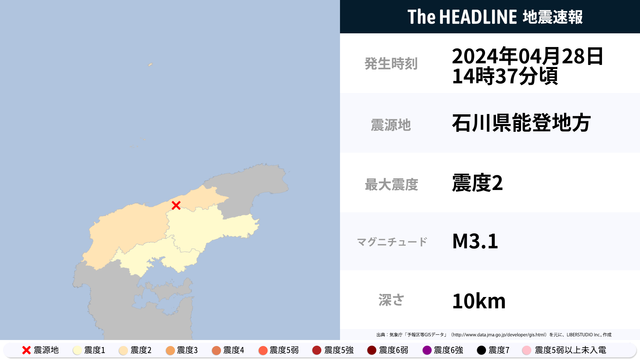 4月28日14時37分頃、石川県能登地方を震源とするマグニチュード3.1の地震が観測された。最大震度2を観測したのは、石川県。