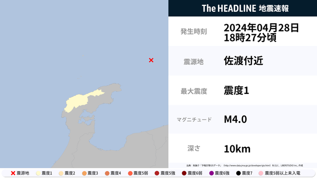 4月28日18時27分頃、佐渡付近を震源とするマグニチュード4.0の地震が観測された。最大震度1を観測したのは、石川県。