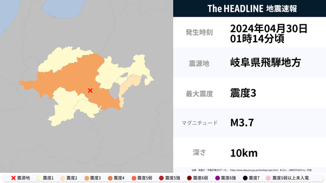 4月30日1時14分頃、岐阜県飛騨地方を震源とするマグニチュード3.7の地震が観測された。最大震度3を観測したのは、長野県・岐阜県。