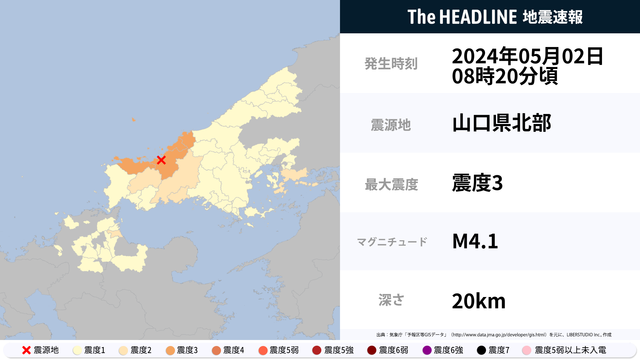 5月2日8時20分頃、山口県北部を震源とするマグニチュード4.1の地震が観測された。最大震度3を観測したのは、山口県。