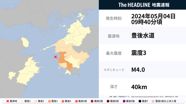 05月04日09時40分頃、豊後水道を震源とするマグニチュード4.0の地震が観測された。最大震度3を観測したのは、愛媛県・高知県。