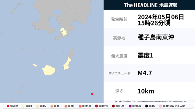 5月6日15時26分頃、種子島南東沖を震源とするマグニチュード4.7の地震が観測された。最大震度1を観測したのは、鹿児島県。