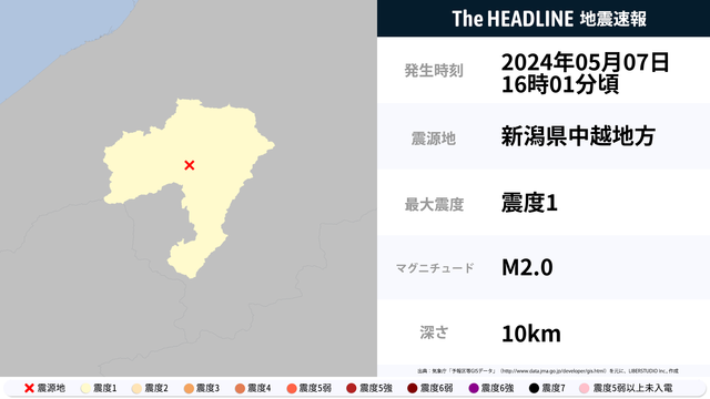 5月7日16時2分頃、新潟県で最大震度1の地震を観測