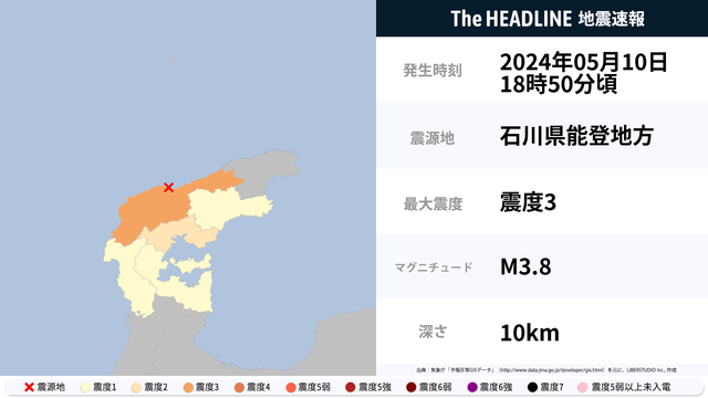5月10日18時50分頃、石川県能登地方を震源とするマグニチュード3.8の地震が観測された。最大震度3を観測したのは、石川県。