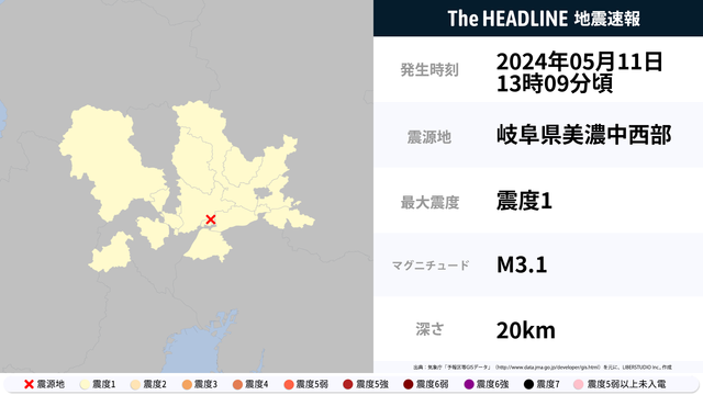 5月11日13時9分頃、岐阜県美濃中西部を震源とするマグニチュード3.1の地震が観測された。最大震度1を観測したのは、岐阜県・愛知県。