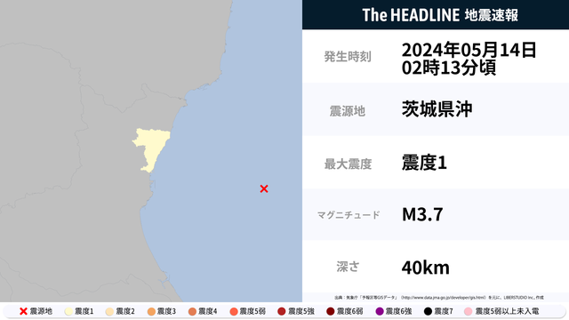 5月14日2時13分頃、茨城県沖を震源とするマグニチュード3.7の地震が観測された。最大震度1を観測したのは、茨城県。