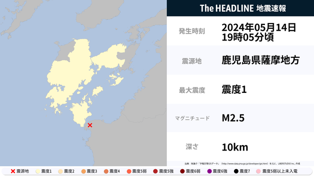 5月14日19時5分頃、鹿児島県薩摩地方を震源とするマグニチュード2.5の地震が観測された。最大震度1を観測したのは、熊本県・鹿児島県。