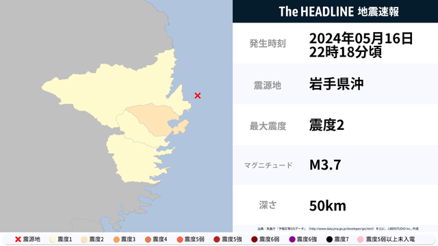 5月16日22時18分頃、岩手県沖を震源とするマグニチュード3.7の地震が観測された。最大震度2を観測したのは、岩手県。
