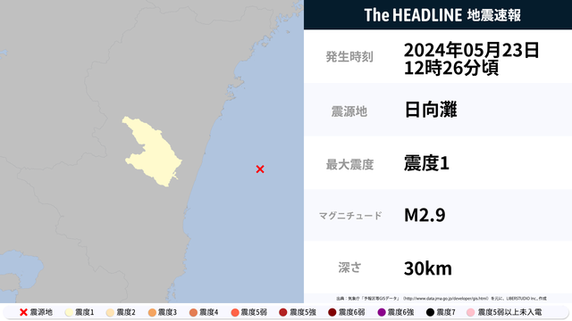 5月23日12時26分頃、日向灘を震源とするマグニチュード2.9の地震が観測された。最大震度1を観測したのは、宮崎県。