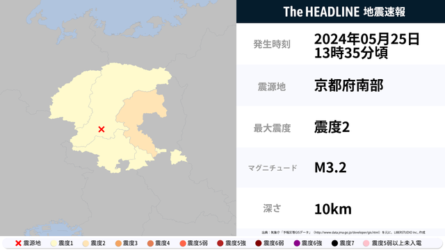 5月25日13時35分頃、京都府南部を震源とするマグニチュード3.2の地震が観測された。最大震度2を観測したのは、京都府。