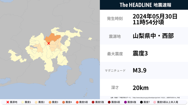 5月30日11時54分頃、山梨県で最大震度3の地震を観測